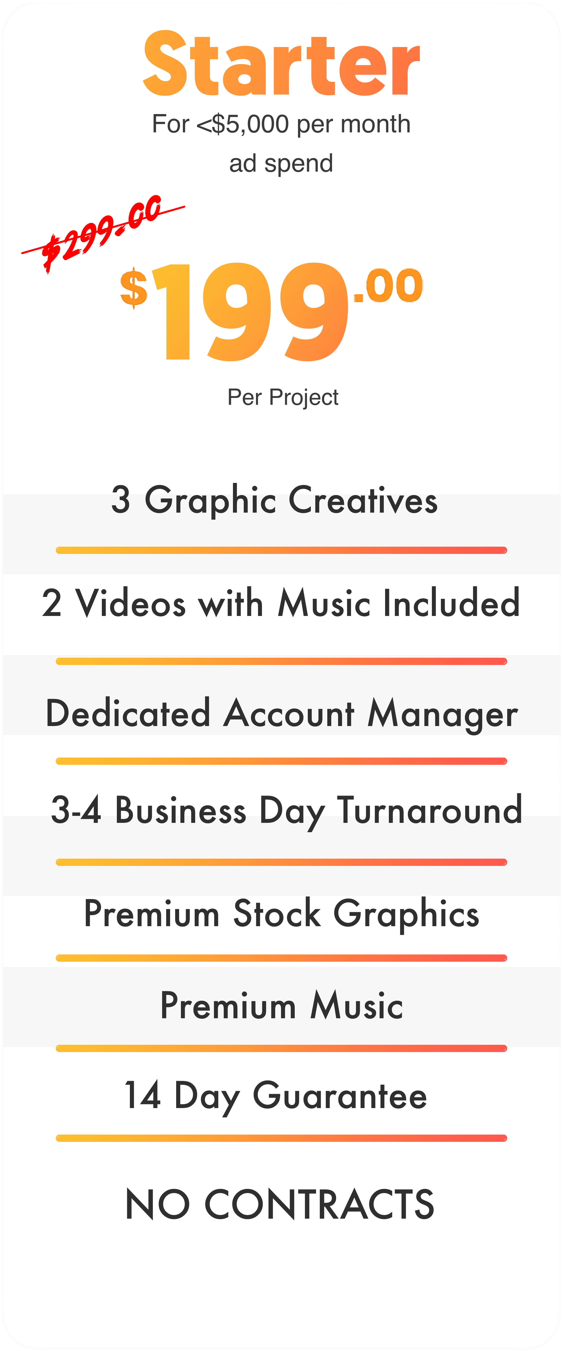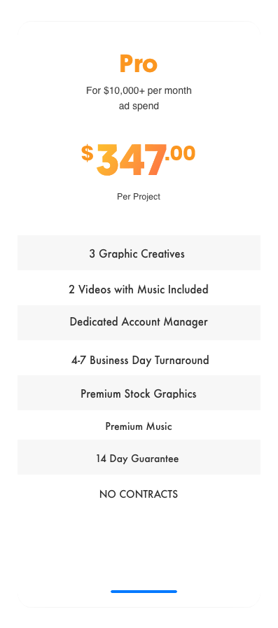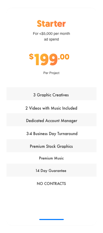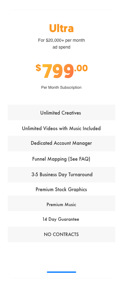 Companies that are spending at least $20,000 or more per month are going to need a TON of creatives. With that capital, ads can be tested very fast and you can easily find winners. Part of marketing is continual testing and being able to progressively test more and more to get better. Ads don't last forever and will eventually start to deflate. This means you might need potentially more than 5-10 creatives a month. In this plan, we also work even MORE closely with you on perfecting the structure of your funnel to be a driver for revenue.